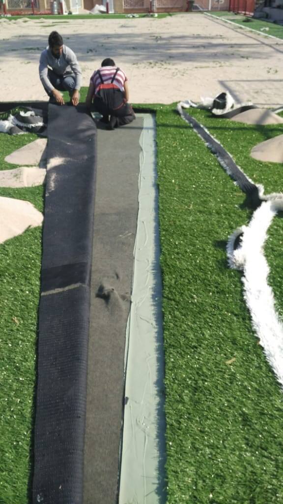 پس از اجرای زیرسازی چمن مصنوعی یک لایه ژئوتکس روی سطح زمین پهن میشود. لایه ژئوتکستایل یک لایه نمدی شکل است که سبب افزایش انعطاف پذیری سطح چمن مصنوعی میشود. پس از پهن کردن این لایه، رولهای چمن مصنوعی پهن شده و این رولها با استفاده از چسب سمینگ تیپ و پلی اورتان به یکدیگر متصل میشوند.